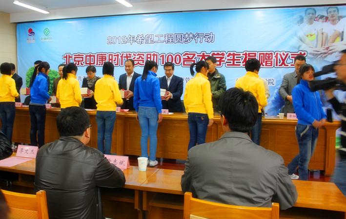 2012年10月18日下午,2012年“希望工程圆梦行动”中康时代资助百名大学生捐赠仪式在张家口市河北北方学院隆重举行。