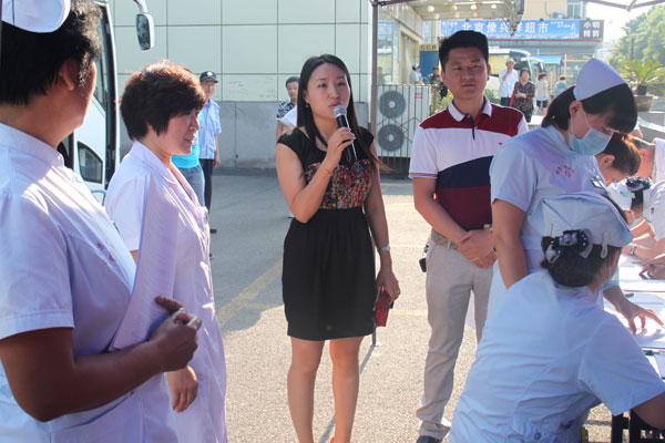 顺义区卫生局医政科科长刘春颖现场讲话,号召广大市民积极参与到无偿献血活动中来