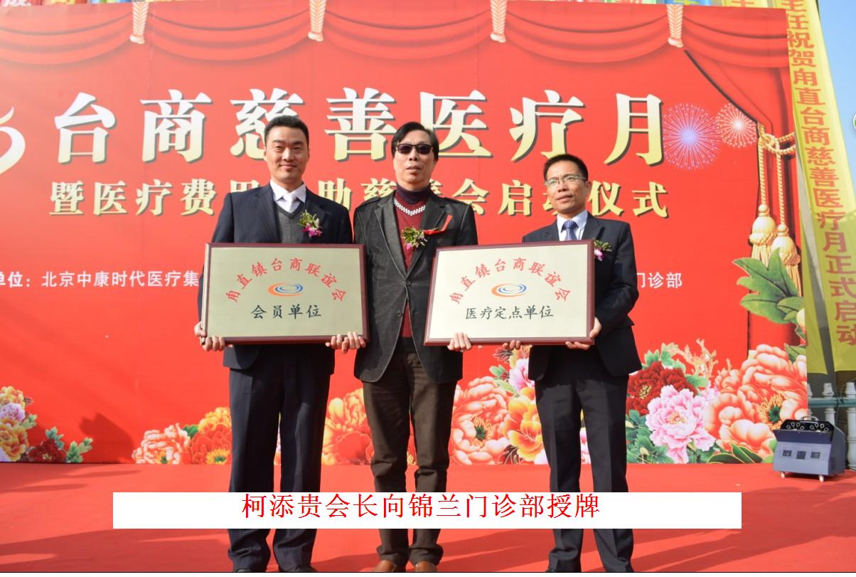开幕式当天,甪直人大副主席朱学新、甪直台商联谊会会长柯添贵出席启动仪式。专家代表张国庆、台商联谊会会长柯添贵、北京中康时代医疗集团副总经理唐细华分别致辞,柯添贵会长代表台商联谊会授予锦兰门诊部“甪直台商联谊会会员单位”、“甪直台商联谊会医疗定点单位”牌匾,锦兰门诊部全体员工现场宣读承诺书,唐副总、柯会长、郑主任等领导上台为医疗月剪彩,最后唐副总宣布甪直台商慈善医疗月正式启动。